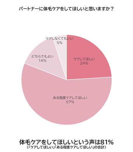 恋人や夫などより身近であるパートナーに体毛ケアをしてほしいと思うかという問いに対して81%(ケアしてほしい24%と、ある程度ケアしてほしい57%の合計)が「してほしい」と回答しており、対人関係の距離によって意識の差が見られました。