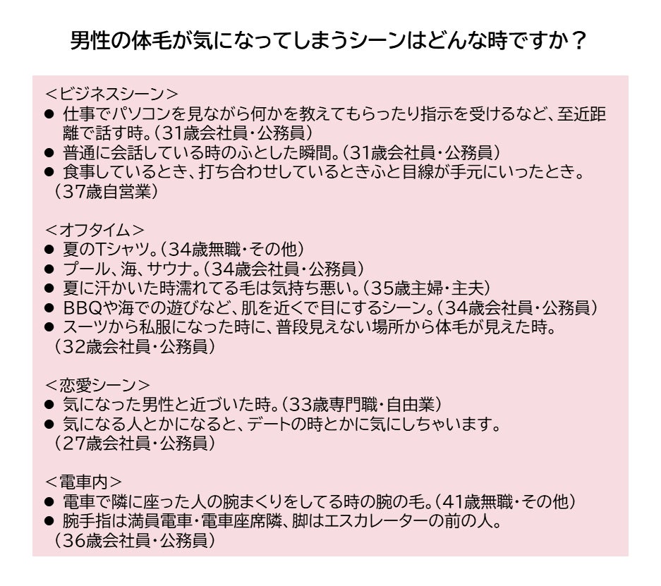 体毛が気になるシーンを具体的に質問したところ、「打ち合わせ中に手元に目が行ったとき(37歳自営業)」「BBQや海での遊びなど、肌が見えるシーン(34歳会社員)」「気になった男性に近づいた時(33歳専門職)」「満員電車での腕や脚(36歳会社員)」などの声がありました。女性は日常の何気ないシーンで体毛が気になるようです。