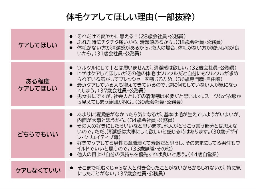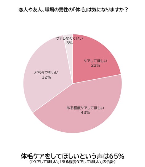 恋人・友人・職場の人など、男性に対して体毛ケアをしてほしいと思う人は65%(ケアしてほしい22%と、ある程度ケアしてほしい43%の合計)。ケアしてほしい理由を紐解いてみると、「それだけで爽やかに思える!(28歳会社員・公務員)」「体毛がない方が清潔感があるから。恋人の場合、体毛がない方が触り心地が良いから。(31歳会社員・公務員)」「最近ケアしている人も増えてきているので、逆に何もしていない人が気になってしまう。(37歳会社員・公務員)」といった声が寄せられました。体毛ケアすることは、清潔感や爽やかさにつながるといえそうです。一方で、「外見より内面」「ケアしていても、していなくてもそれぞれ素敵」といった理由から、どちらでもよいと回答した人は35%でした。