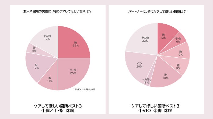 ■ケアしてほしい箇所は、友人や職場の男性に対しては①腕、手・指 ③胸で、恋人や夫など身近なパートナーに対しては①VIO ②脚 ③腕と、関係性によって異なる結果が示されました。