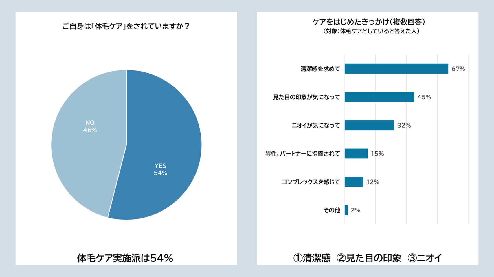 女性が男性の体毛ケアを肯定的に捉え、好感度が高い一方で、体毛ケアを実施している男性は54%にとどまっています。体毛ケアを始めたきっかけは、「清潔感を求めて」が67%で最も多く、次いで「見た目の印象が気になって」が45%、3番目に「ニオイが気になって」が32%という結果でした。