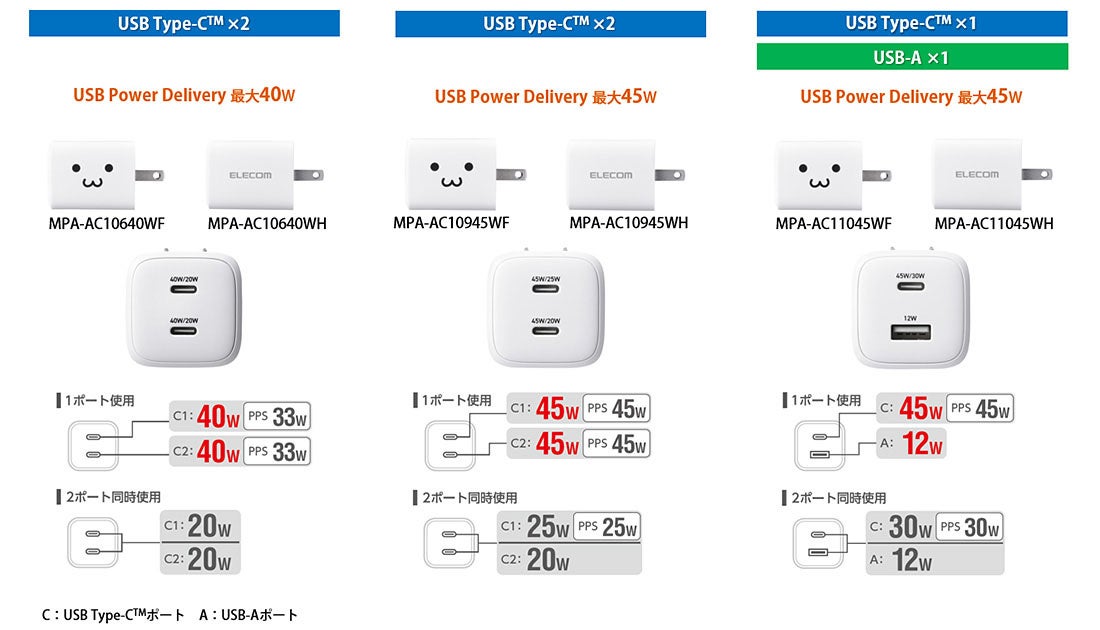いずれも2ポートを搭載、1ポート使用時の最大出力が40Wと45Wから選べます。