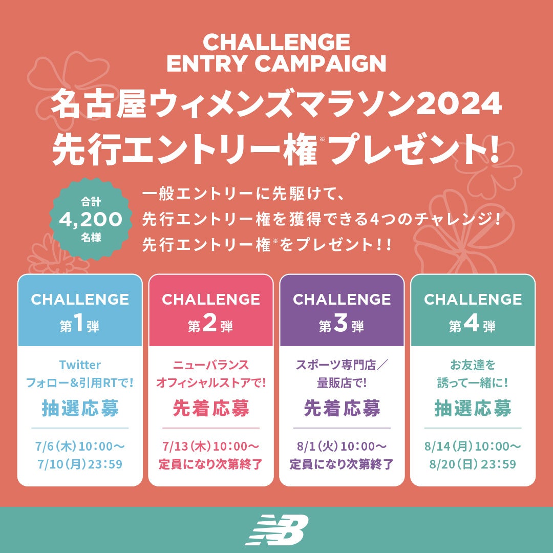 一般エントリーに先駆けて2024年大会の先行エントリー権を獲得できる「ニューバランスチャレンジエントリーキャンペーン」の第1弾が7月6日(木)よりスタート。さらに7月13日(木)以降順次第2弾、第3弾、第4弾キャンペーンも予定しています。