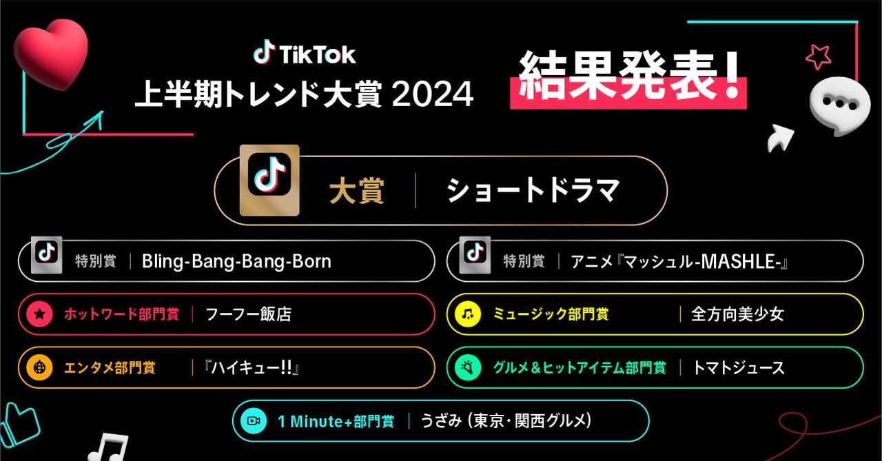 「TikTok上半期トレンド大賞2024」大賞は「ショートドラマ」に決定!Creepy Nutsの「Bling-Bang-Bang-Born」とアニメ『マッシュル-MASHLE-』が特別賞を受賞!