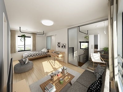 らせん階段によりコンパクトな間取りを実現したミニマムサイズのシングル層向け商品