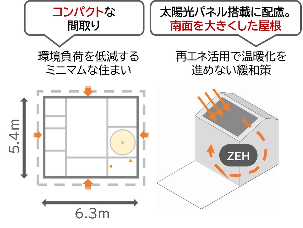 ・建物が小さくても充分な太陽光パネルを搭載できるよう、屋根形状に配慮しています。