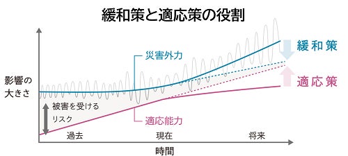 現在、社会全体で気候変動による被害をどう防ぐかが共通の課題となっています。気候変動への対策は、温室効果ガスの排出量を省エネルギー化などにより減らす「緩和策」と、災害に備え現在および将来の気候変動に対処することで被害を軽減し備える「適応策」の2つがあります。これらは、相互補完的な施策であり、気候変動のリスクを低減するためには両方に取り組むことがますます重要になってきています。