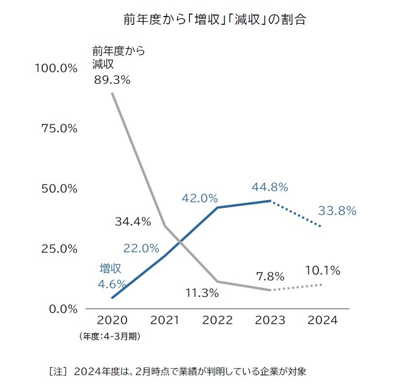 2024年度の業績(見込値を含む)が2月末時点で判明した旅館・ホテル約3400社の動向では、全体の33.8%の企業が前年度から「増収」となった。コロナ禍に伴う行動制限の緩和や水際対策の撤廃により、訪日外国人観光客(インバウンド)の回復が業界全体の追い風となった。北陸地方では、能登半島地震の影響で一部地域の旅館・ホテルで収益が伸び悩んだケースがあったものの、円安を背景に訪日客需要の獲得が好調で宿泊料金などの値上げも進み、高級ホテルからビジネス旅館・ホテルまでの幅広い施設で業績が好調だった。大都市圏では、観光・ビジネス目的の宿泊客が戻り、稼働率の改善が顕著だった。地方においても国内旅行支援策が後押しし、温泉地やリゾートホテルなどの施設の稼働率が回復したことも、全体を押し上げた要因だった。