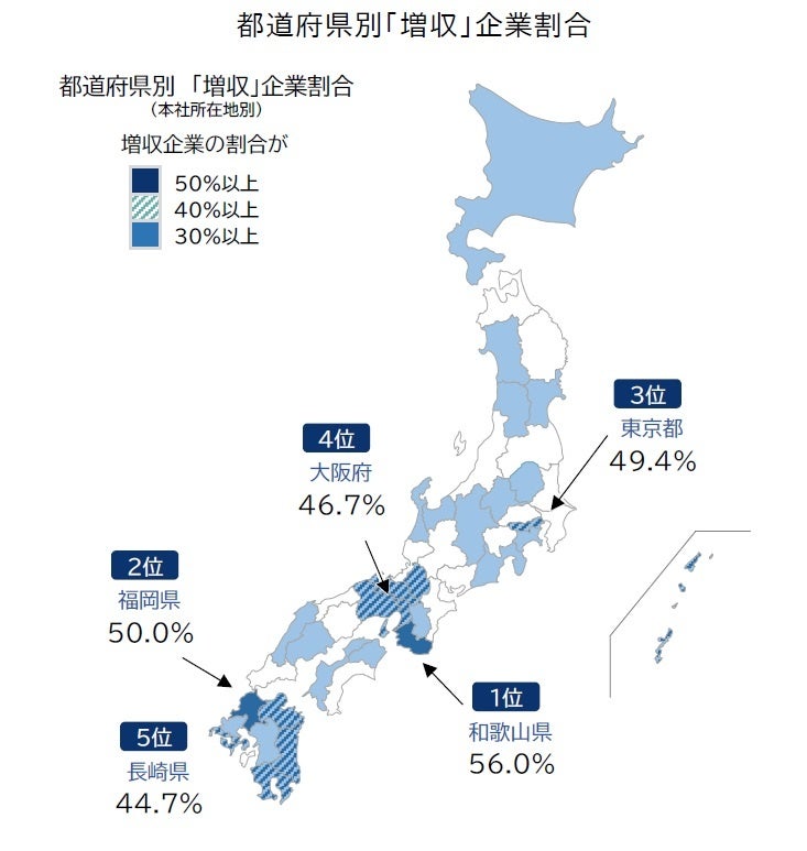 都道府県別にみると、2024年度に「増収」となった旅館・ホテルの割合が最も高かったのは「和歌山県」で、56.0%が増収となった。また、「福岡県」(50.0%)や「長崎県」(44.7%)をはじめ、九州地方で「増収」となった割合が高い県が多かった。アジアを中心とした訪日観光客の宿泊需要が旺盛だったほか、首都圏や近畿圏など大都市部からの出張需要なども取り込み、高い稼働率を維持した企業が多くみられた。