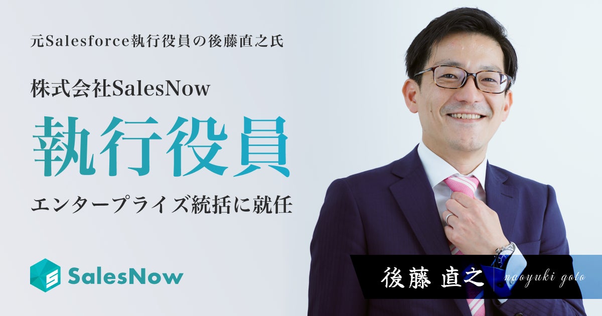 「誰もが活躍できる仕組みをつくる。」をミッションに掲げる株式会社SalesNow(本社:東京都渋谷区、代表取締役:村岡功規、以下「当社」)は、エンタープライズ分野の更なる事業拡大と組織力強化を目指し、元Salesforce執行役員の後藤 直之 氏を執行役員として迎えることを発表いたしました。後藤氏の参画により、当社は「エンタープライズ攻略」を加速し、BtoBセールスの新たな価値を創出する体制を構築してまいります。