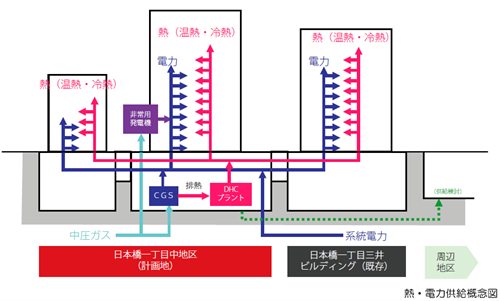 C街区地下にはエネルギーセンターを設置し、「電気」と「熱」を供給します。コージェネレーションシステム(CGS)による排熱利用や中圧ガス発電の採用により、停電時でも事業継続を可能とする強靭なエネルギーシステムを構築します。将来的には周辺地区への供給も検討し、エリア全体の安心・安全を支えます。