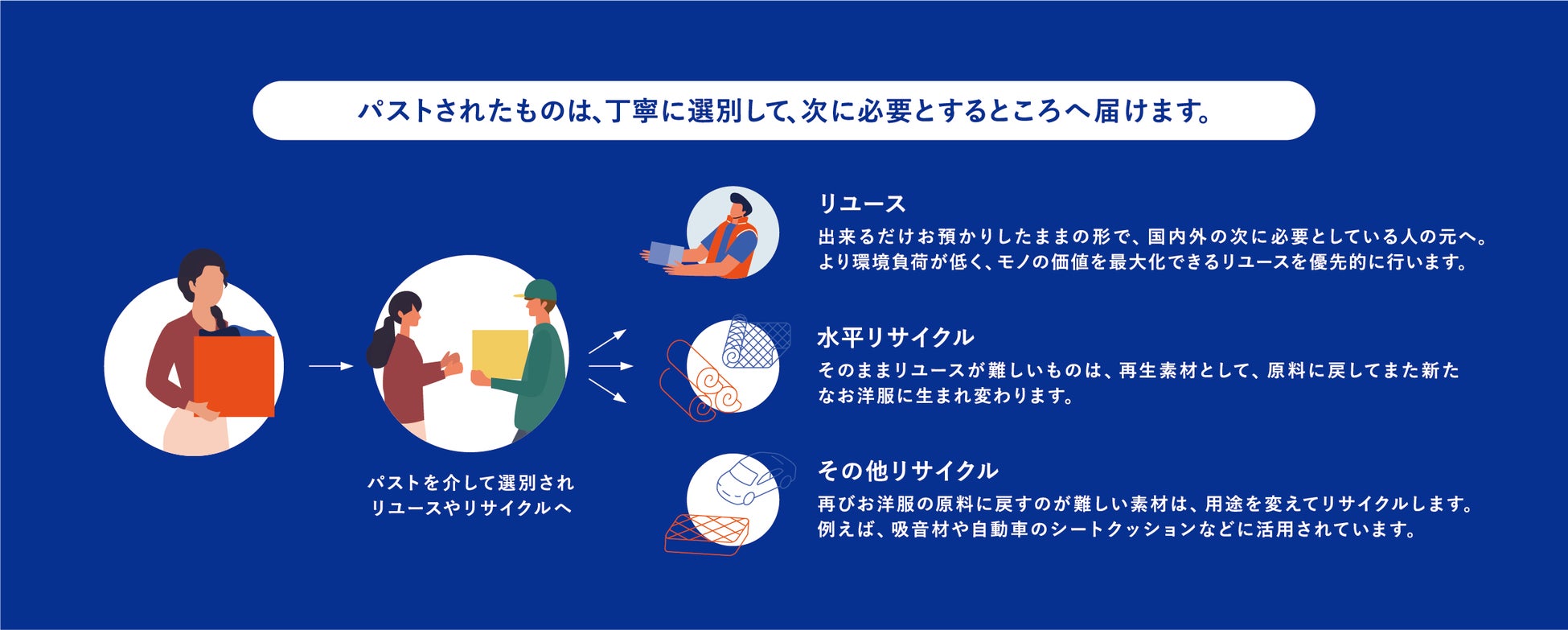 ECOMMITが提供する資源循環サービス「PASSTO(パスト)」のスキームを活用し、宅配にて家庭の不要品を回収します。回収の必須アイテムをいれることで、ユーザーは自宅から簡単に送料無料で不要品を発送できます。回収した不要品は、ECOMMITにより国内外でリユース品として再流通されるほか、リユースが難しいものに関してはリサイクルパートナーを通じて再資源化されます。