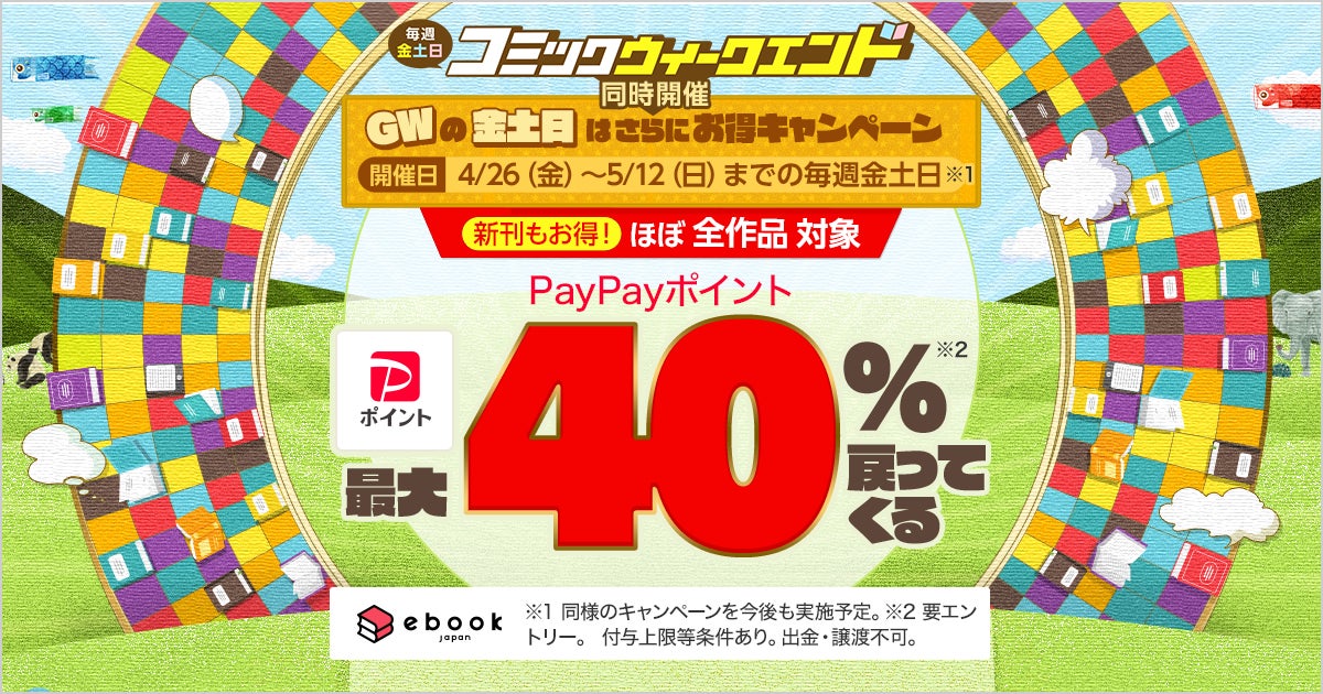 最大40%お得!ebookjapanで週末(金土日)の「コミックウィークエンド」と併せて、金土日は最大40%お得になるキャンペーン開始