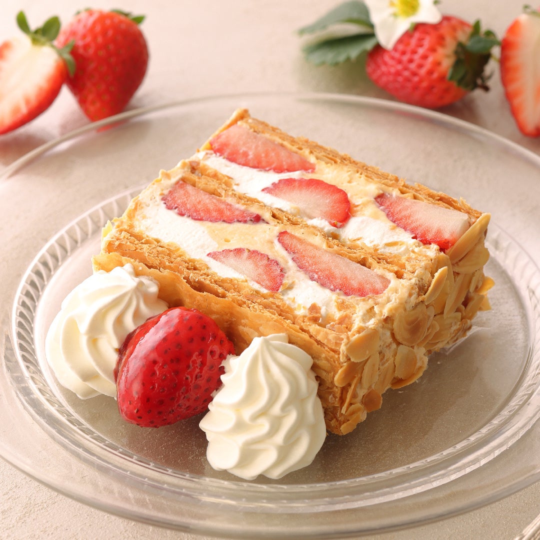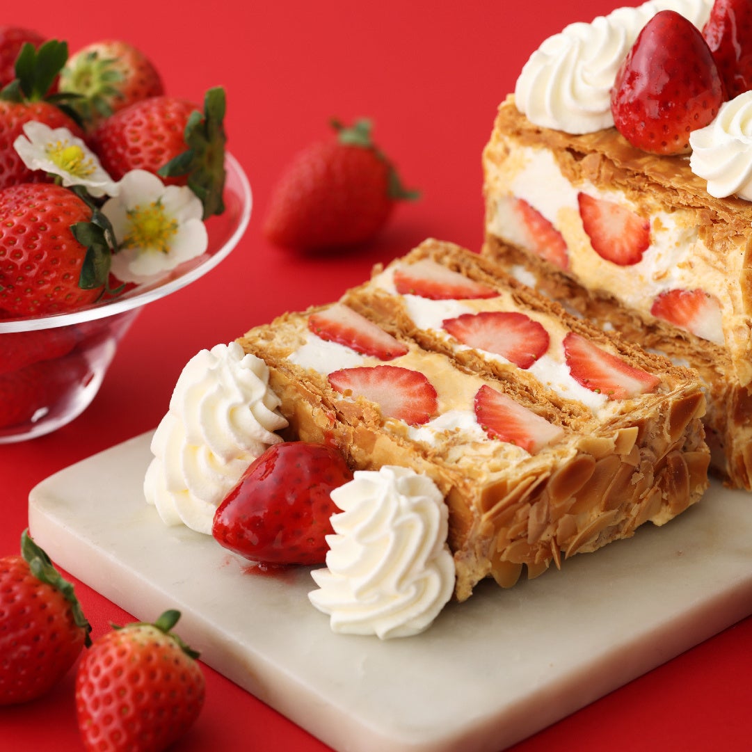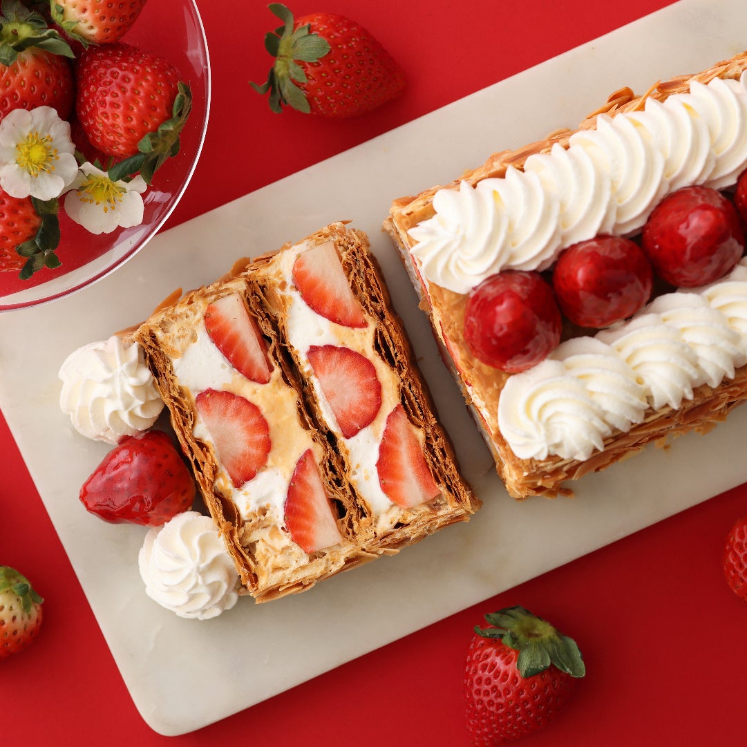 今回、青山本店で展開するナポレオンパイは「いちごさん」が主役。みずみずしく甘い苺、サクサクのパイ生地、なめらかなクリームが重なり合う、旬の美味しさを心ゆくまでご堪能ください。