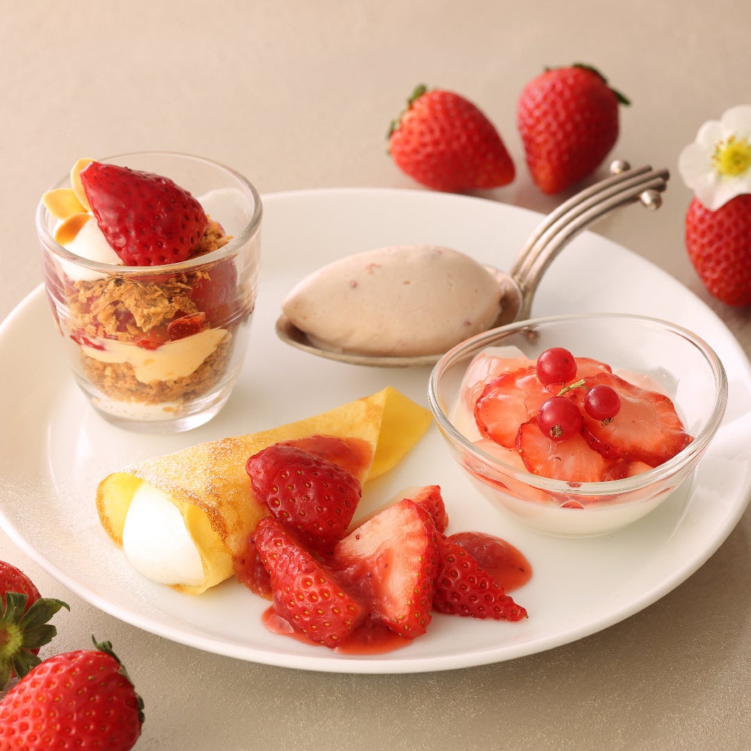 こだわり卵のプリン、クレープ、ショートケーキ、クラムパイ、パンナコッタなど、中まで赤い美しい見た目、みずみずしくやさしい甘さが特長の「いちごさん」を使った個性豊かな苺スイーツがお楽しみいただけます。ワインともよく合うキハチ自慢のセイボリーと一緒にどうぞ。