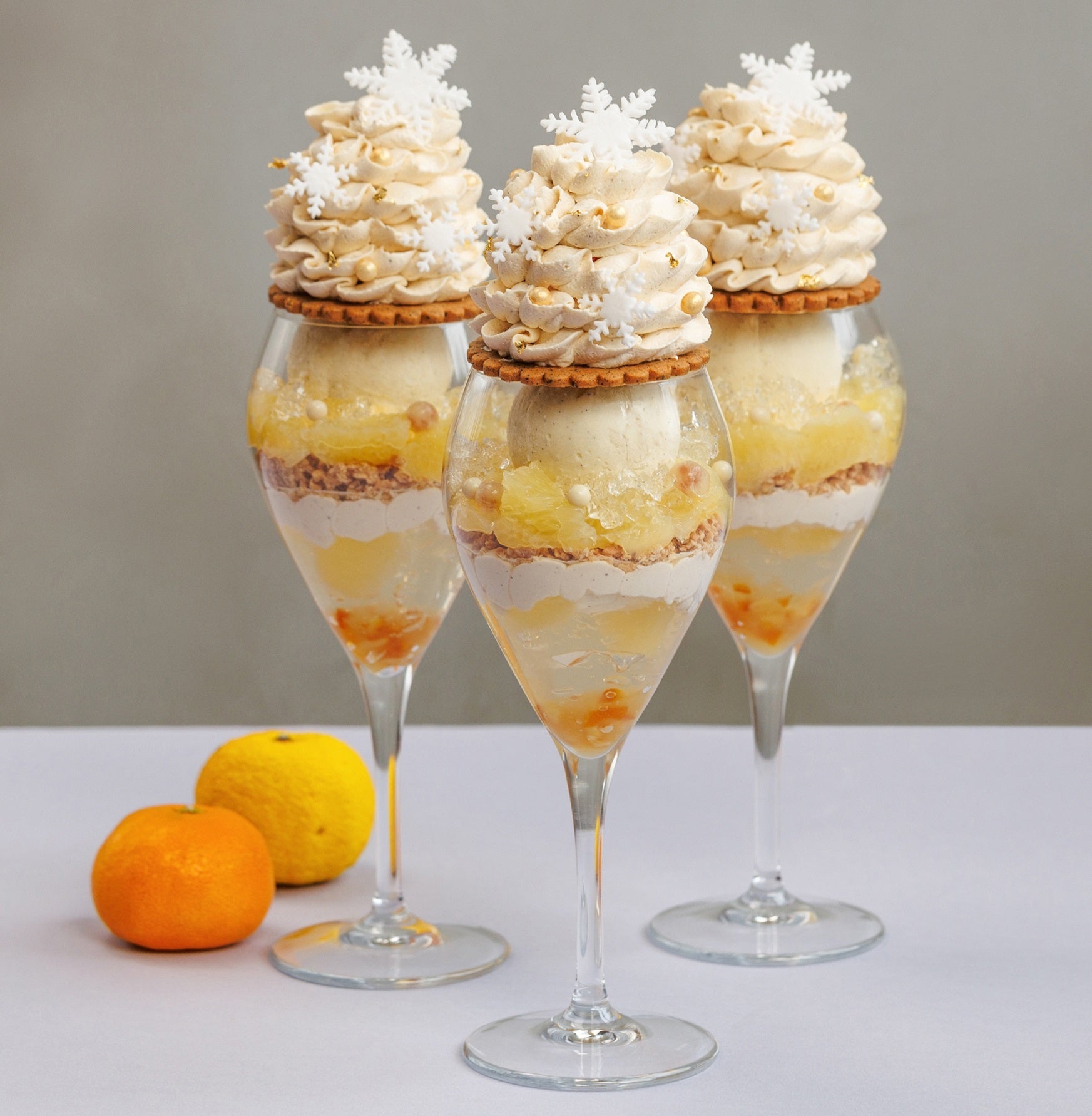 柑橘にアールグレイの優雅な香りを合わせ、白雪をイメージしたパフェ。 ベルガモットやオレンジ、グレープフルーツの甘酸っぱさにアールグレイのメレンゲやサブレをアクセントにお楽しみいただけます。 ペアリングにアールグレイの紅茶がおすすめです。