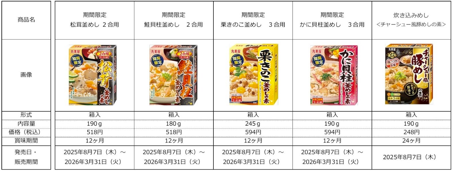 丸美屋「期間限定 釜めしの素シリーズ」 「炊き込みめしシリーズ」の新商品が登場 〜2025年8月7日(木)に全国で発売開始〜