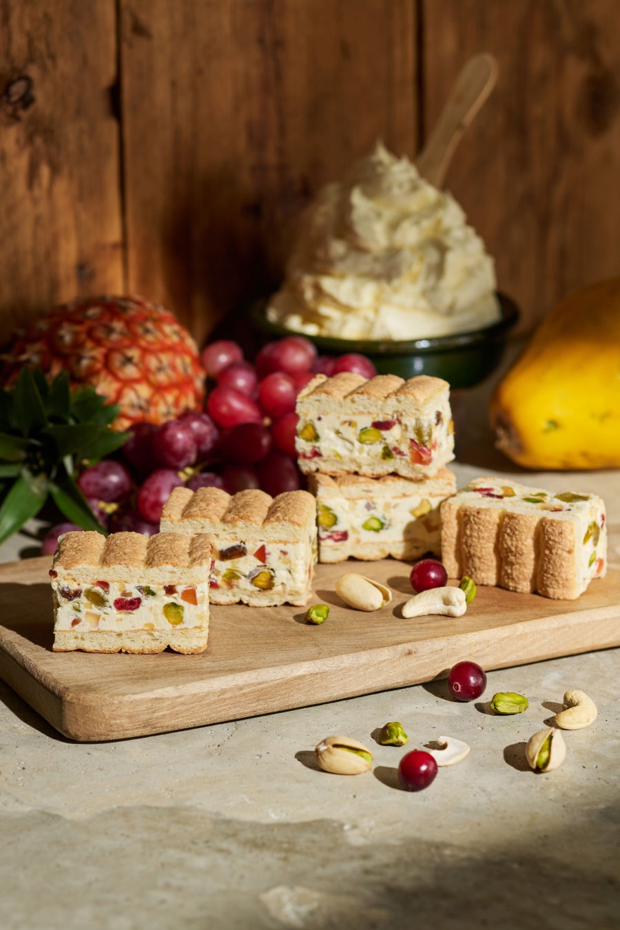 2025年6月1日(日)に販売を開始する新商品『果実とバターのサンド』は、ピスタチオ・カシューナッツ・パイナップル・パパイヤ・レーズン・クランベリーなど6種類の果実と、芳醇なバターをあわせたバタークリームを、香ばしく焼き上げたダックワーズ生地で、惜しげもなくサンドした、まさに“果実とバター”を感じていただける商品です。