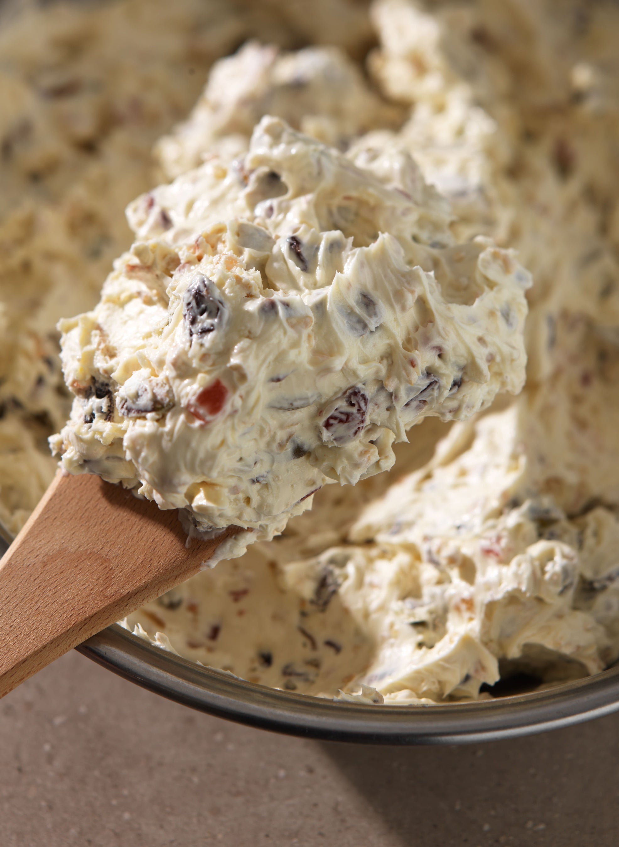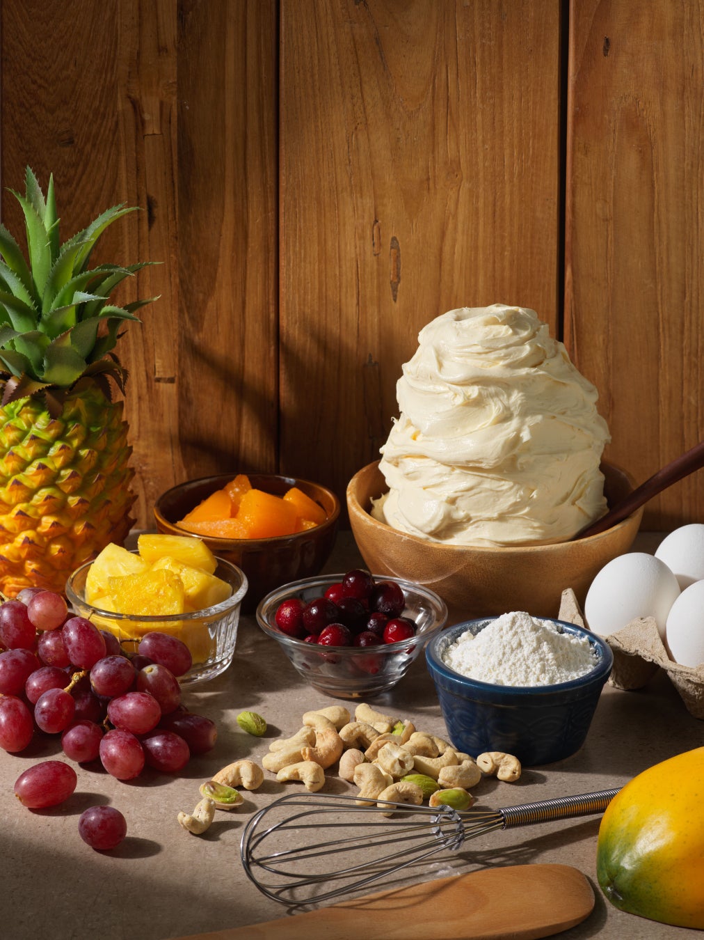 今回の商品の一番の特徴は、果実感たっぷりに仕上げたバタークリームです。なめらかなバタークリームに、あえて食感を残して混ぜ込んだナッツと、やわらかい4種のフルーツが、味わいや食感のコントラストになり、最後まで美味しく召し上がりいただけます。生地には軽い食感のダックワーズを使用。香ばしい生地と、果実感たっぷりのバタークリームが調和する、満足感のある一品に。