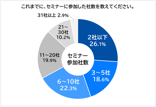 これまで「セミナー参加」を経験した社数について、「2社以下」と回答した学生が26.1%に上りました。「3~5社」18.6%、「6~10社」22.3%となっており、「10社以下」と回答した学生が7割に迫りました。「業界を絞っている人は、セミナー参加社数が5社以下や、10社以下の人が多いと思う」「インターンシップに複数参加しているので、改めてセミナーに参加している企業は少ない」などの声が寄せられました。既に業界研究や企業研究を済ませていることに伴い、セミナーに参加する企業は絞りこんでいる傾向がうかがえます。一方、「インターンシップに参加していないので、まだ業界を絞っていない。オンラインセミナーも活用して、20社ほどのセミナーに参加した」「大学4年生になってから就職活動を始めたので、これからセミナー参加を増やしていきたい」といった声も上がりました。