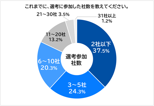 これまで「選考参加」を経験した社数について、「2社以下」と回答した学生が37.5%に上りました。「3~5社」24.3%、「6~10社」20.3%となっており、「10社以下」と回答した学生が8割を超えました。「選考に合格したら、本当に入社したい企業に絞って選考を受けている」「一度に多くの企業の選考を受けるのではなく、合否などの進捗を見ながら選考に参加する企業を決めていきたい」といった声が上がっており、選考に参加する企業を絞り込む傾向がうかがえます。