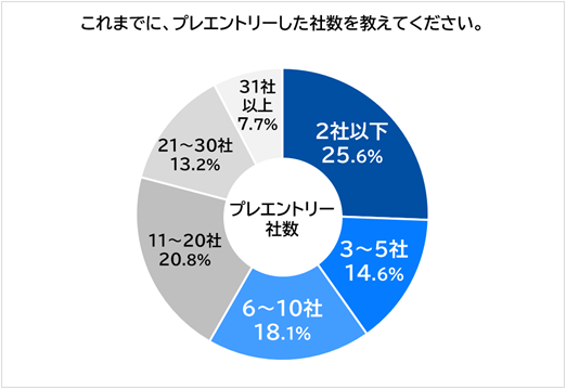 これまで「プレエントリー」した社数について、「2社以下」と回答した学生が25.6%に上りました。4人に1人は、「2社以下」と回答しています。「3~5社」14.6%、「6~10社」18.1%となっており、「10社以下」と回答した学生が6割に迫りました。