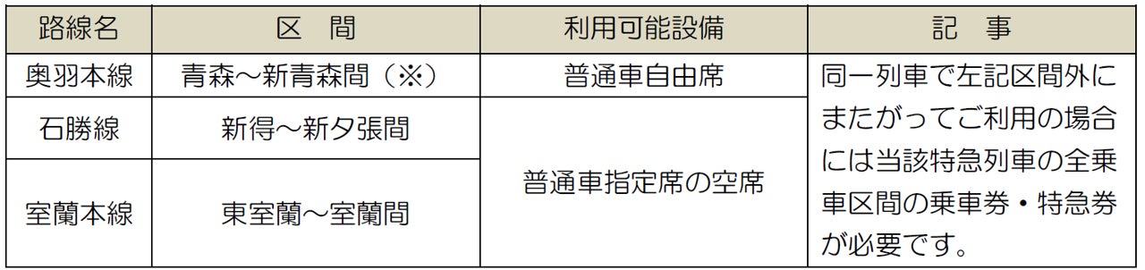 ・別に特定特急券をお買い求めいただくことで、北海道新幹線(新函館北斗~新青森間)の立席(空いている席)がご利用可能。