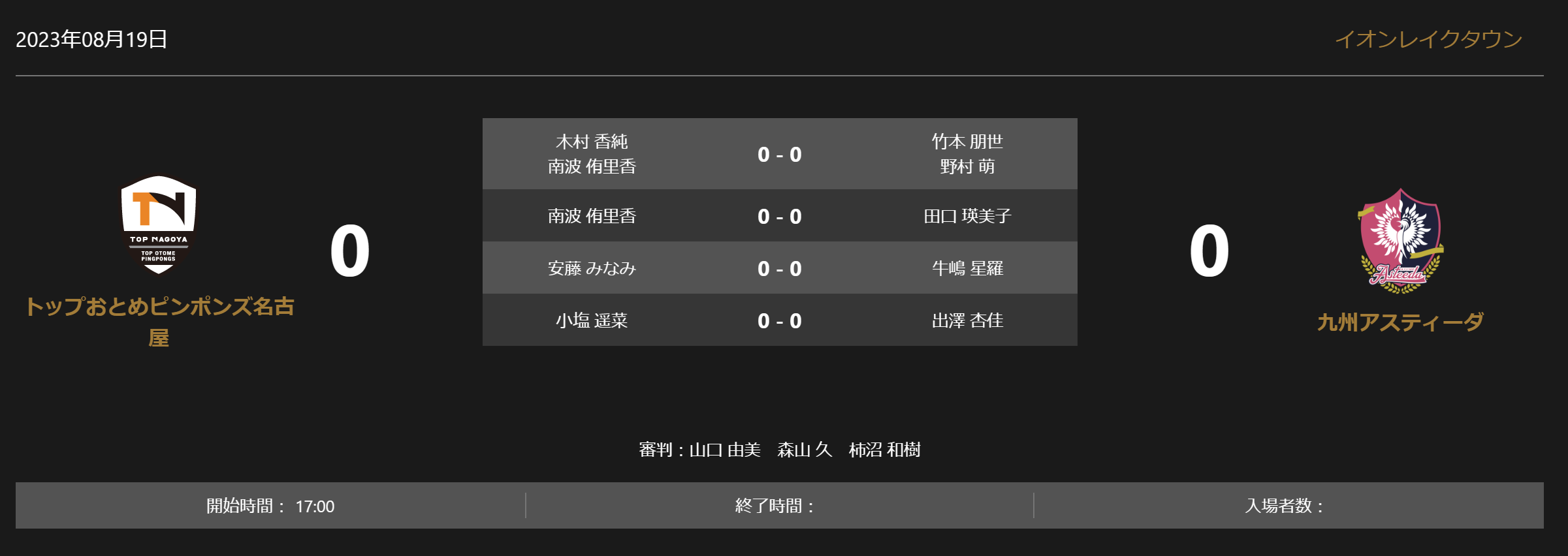 ノジマTリーグ 2023-2024シーズン 公式戦 8月19日 開催 トップおとめピンポンズ名古屋 vs 九州アスティーダ 対戦オーダー発表