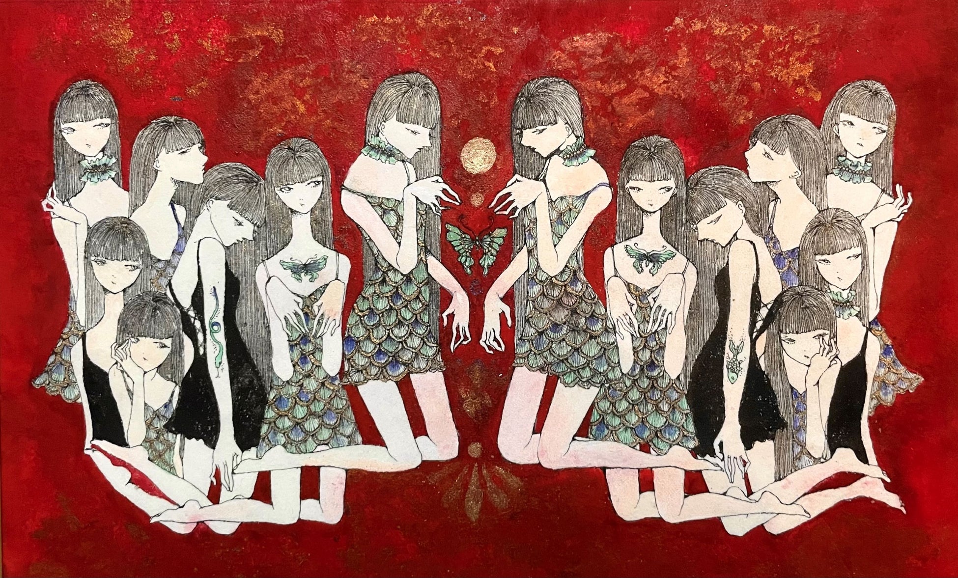 水井晴香は京都市立芸術大学で染織を学んだ後、服飾雑貨デザインの仕事を続けながら絵画制作を行っています。作家の夢野久作や江戸川乱歩、オーブリー・ビアズリーなどから影響を受け、少女や魚、蝶などをモチーフに、耽美な世界を表現しています。生と死、情熱、ときには警戒も表す赤色をベースに使うことで、作品に強さを与えています。