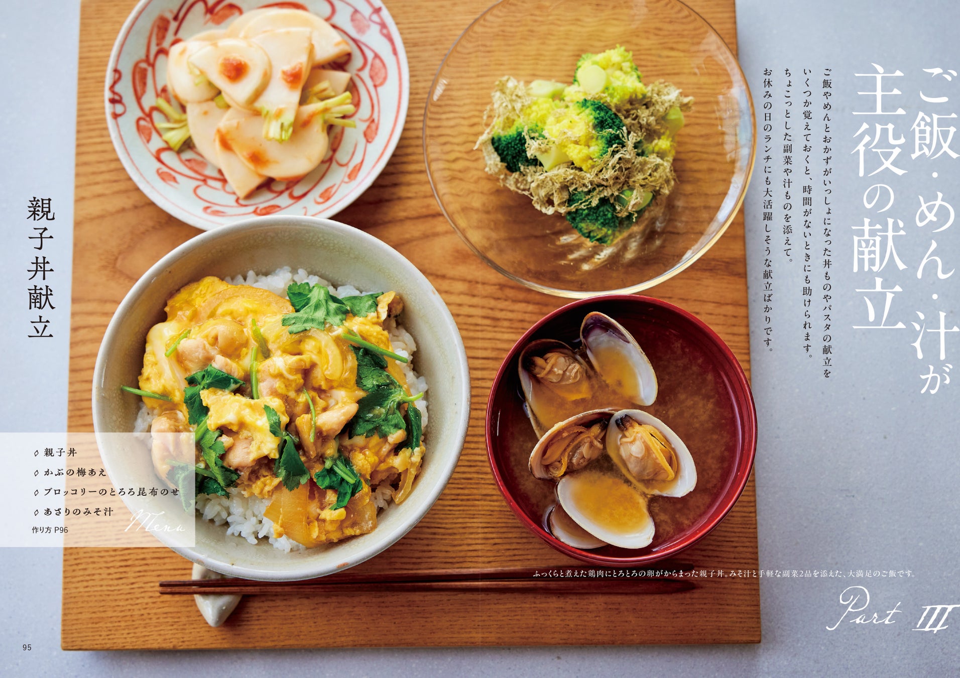 「親子丼献立」、「キーマカレー献立」など、時間のないときに役立つ献立を紹介しています。お休みの日のランチにも大活躍。