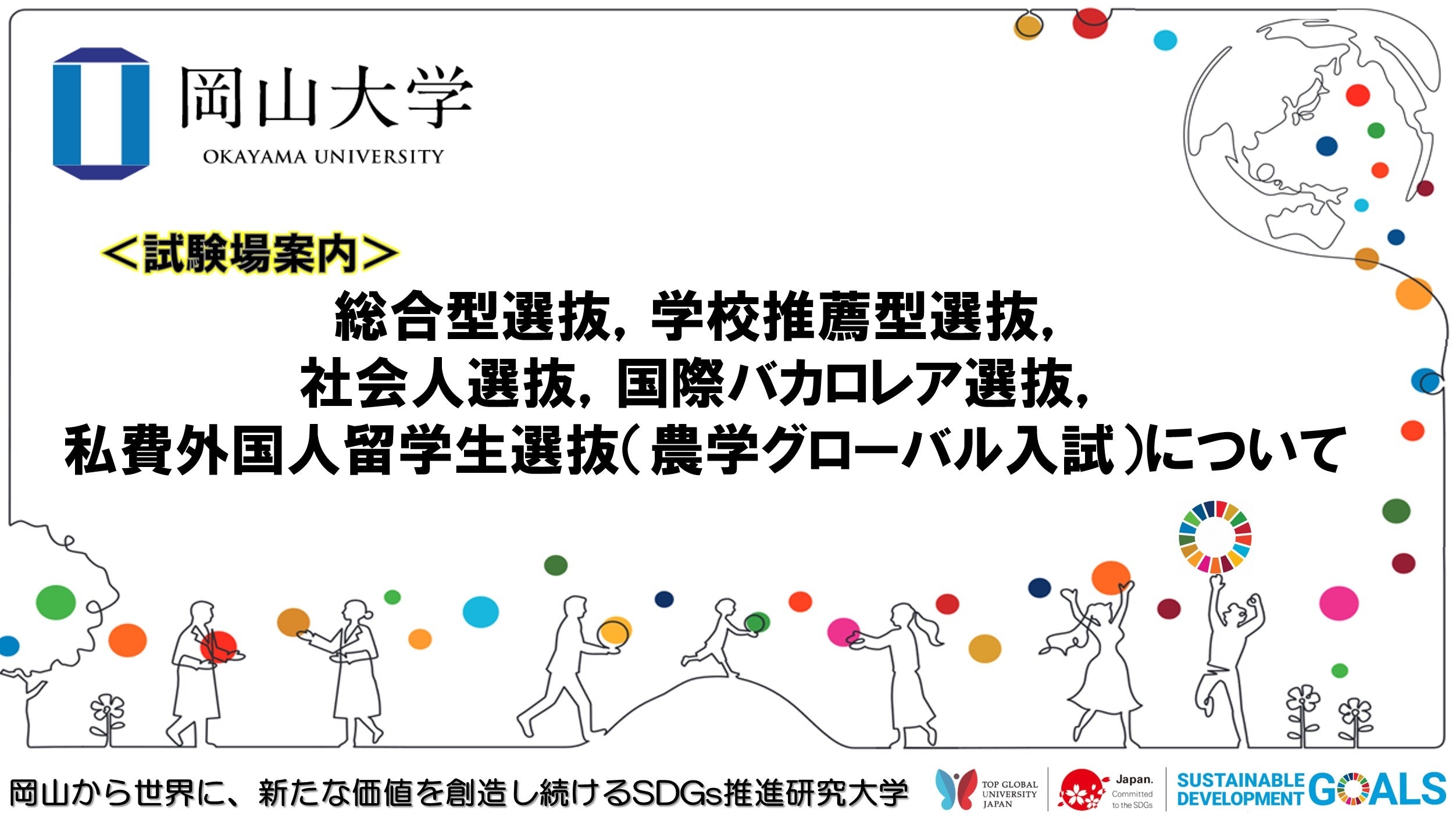 【岡山大学】【試験場案内】総合型選抜,学校推薦型選抜,社会人選抜,国際バカロレア選抜,私費外国人留学生選抜(農学グローバル入試)について
