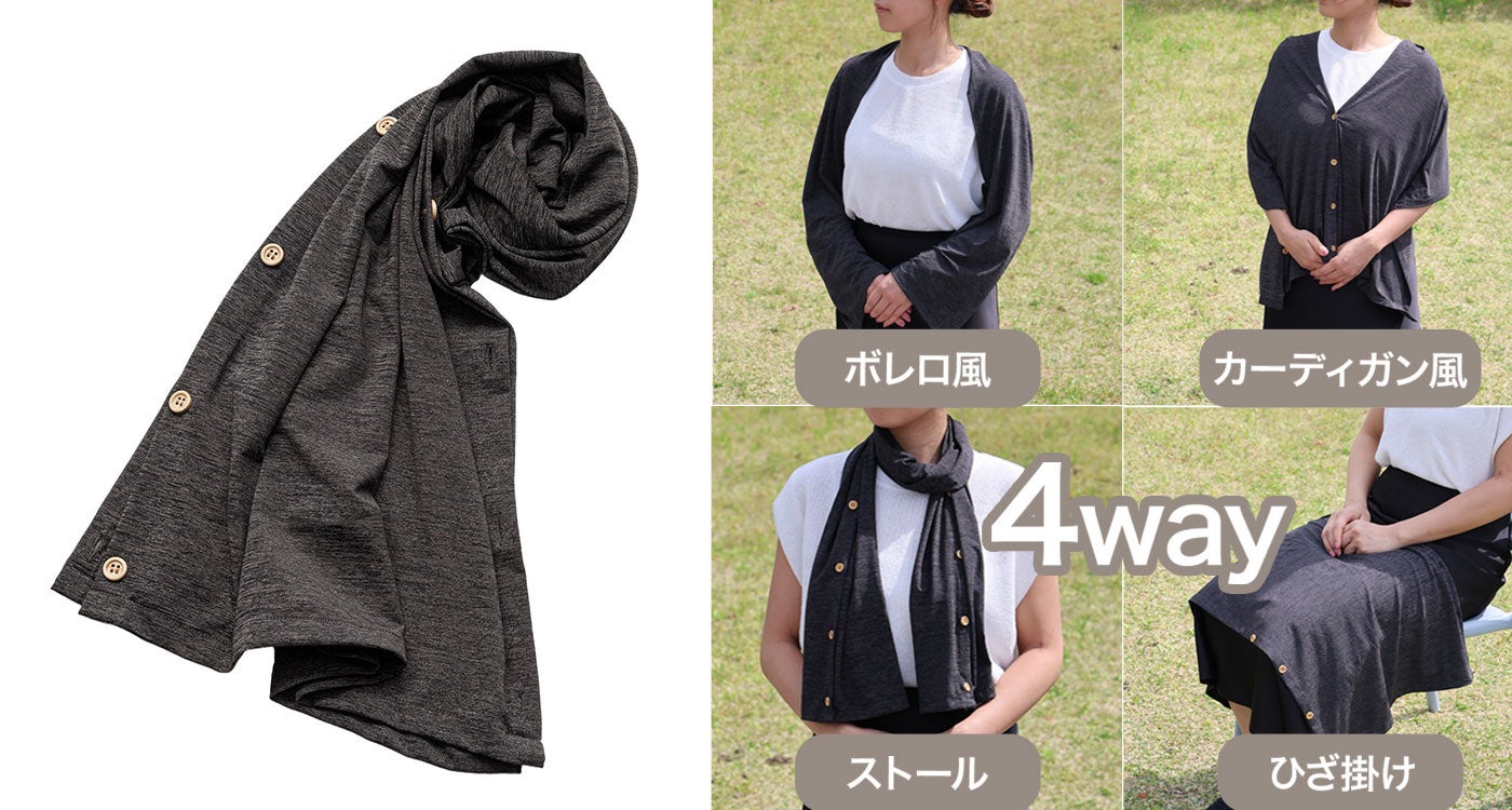 ボレロ風・カーディガン風・ストール・ひざ掛けの4WAYスタイルでご使用可能。紫外線対策として、普段のコーディネートに取り入れやすい色味です。接触冷感生地を使用しているため、暑さ対策としてもご使用いただけます。