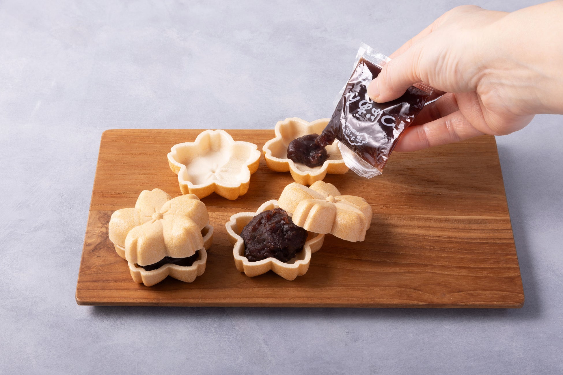 いつでもサクサクとした食感と香ばしさをたのしめるよう、種と餡は別々に。見た目にも美しいさくらの形の種には、国産にこだわったもち米を使用し、餡は北海道産小豆をふっくらと炊き上げた程よい甘さの粒あん。