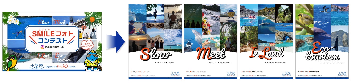 2024年6月、「#小笠原SMILE」をハッシュタグとしたInstagramフォトコンテストを開催いたしました。小笠原諸島で撮影した“笑顔になれる”作品を募集し、SMILEを紐解いた4つのテーマ「Slow」「Meet」「IsLand」「Ecotourism」ごとに採用作品を選定。下記でご紹介する謎解きスタンプラリーの場所(都内4箇所)にあわせて交通広告ポスターとして掲載いたします。