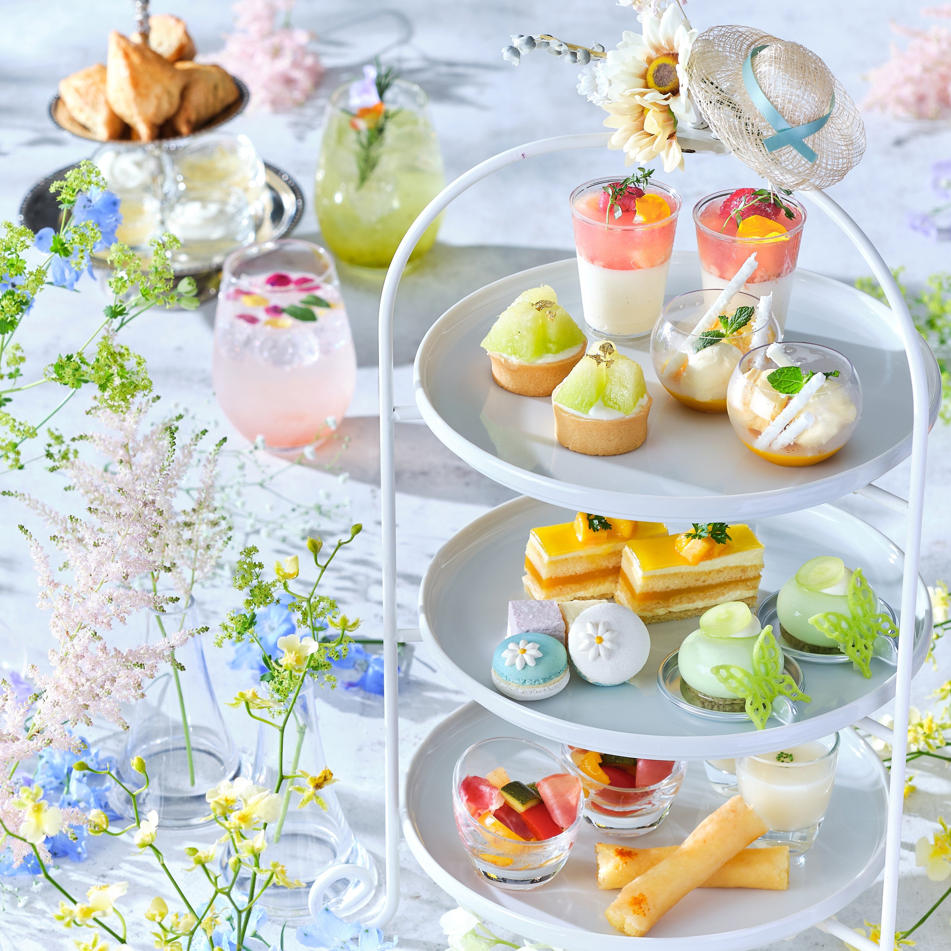 シーズンごとに変わるテーマで、専属パティシエが手掛ける繊細で華やかなスイーツが人気のアフタヌーンティー。サマーシーズンには、桃・メロン・マンゴー・マスカットなど旬のサマーフルーツを贅沢に使った夏らしい“シャーベットカラー”のカラフル&ひんやりスイーツをお届けします。