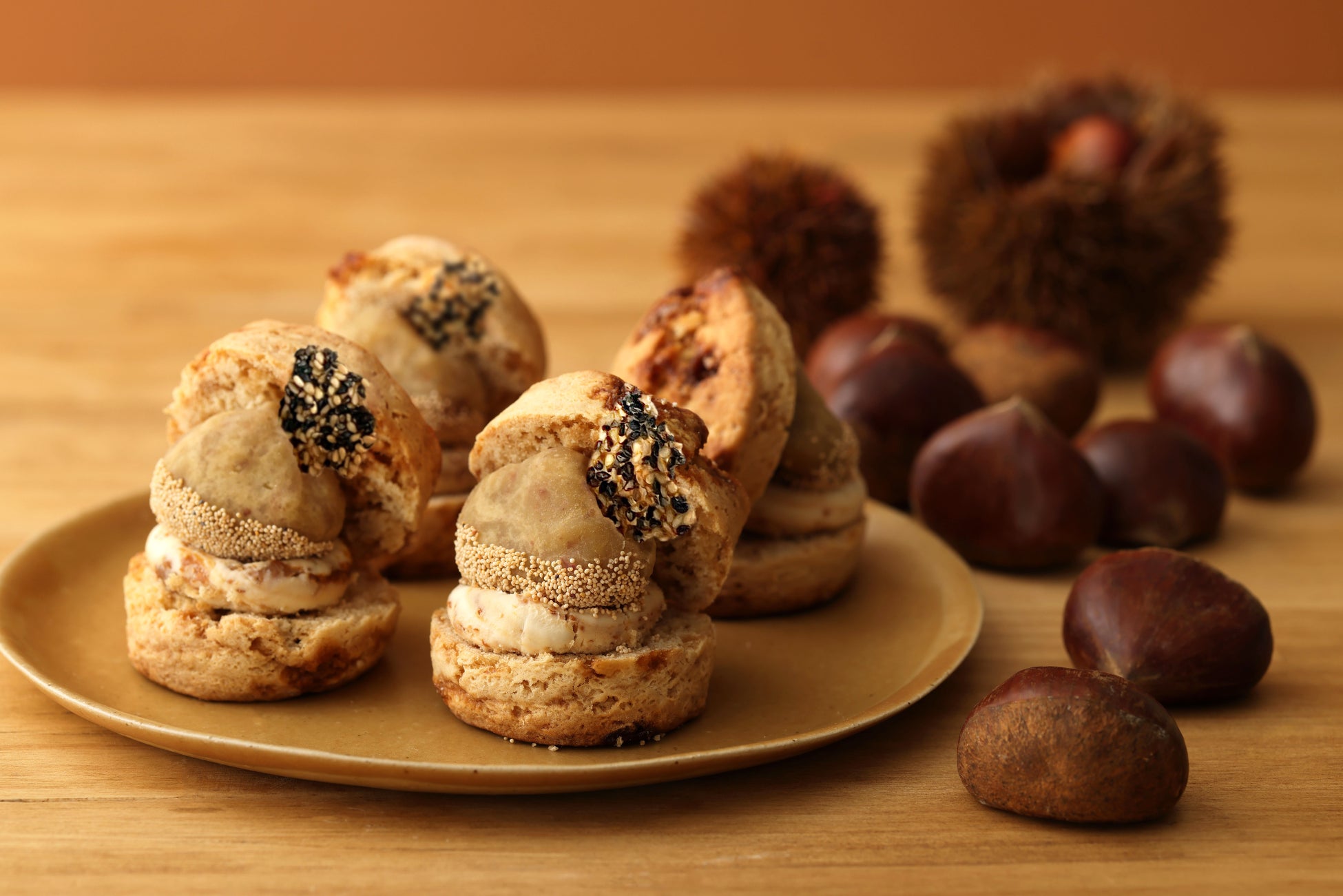 一番のおすすめは、 笠間の栗ペーストで仕立てた“栗きんとん”を、オリジナルの黒糖スコーンで大胆にサンドした「『笠間の栗』の栗きんとんスコーンサンド」。いちじくクリームチーズと香ばしいごまのチュイールが、ほっくりと甘い栗の美味しさを引き立てています。