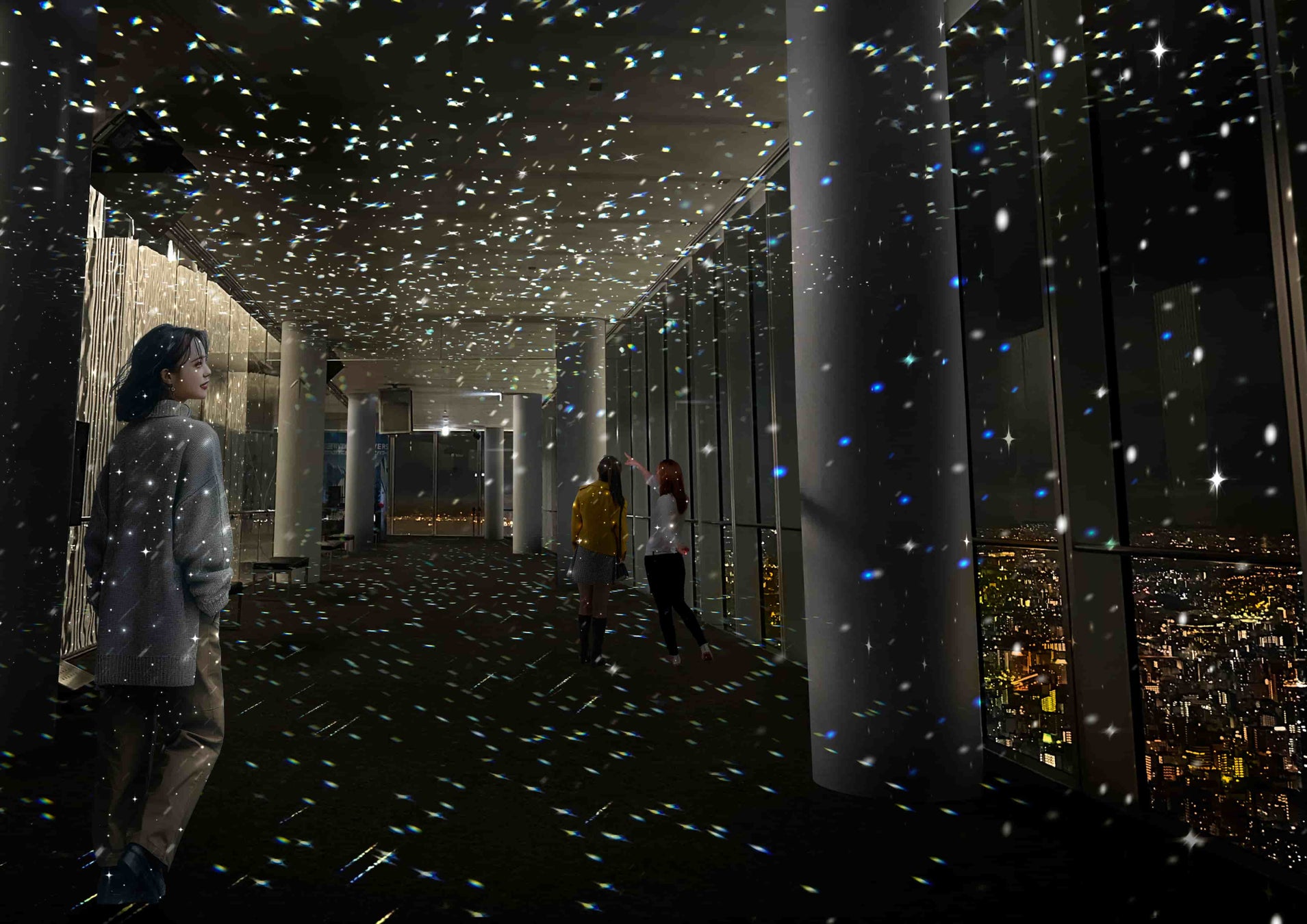 ハルカス300(展望台)から望む大阪の夜景とともに、まるで満点の星空のようにキラキラと瞬く光のアートに360度包まれる幻想的な空間に。