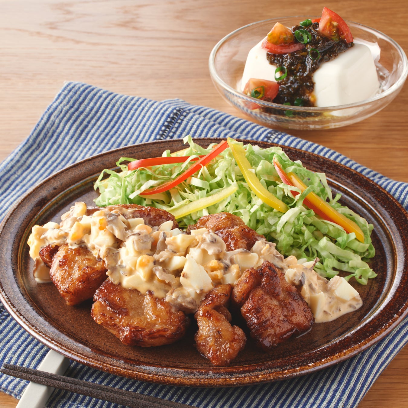商品説明:秋田出身の佐々木希さんコラボメニュー。秋田を代表する調味料「しょっつる」で味付けしたチキンに、食感がよくスモーキーな味わいがやみつきになる「いぶりがっこ」をたっぷり入れたタルタルをかけ、ごはんが進むおかずにしました。副菜は海藻「ギバサ」を使った、さっぱり感がやみつきになる冷ややっこです。