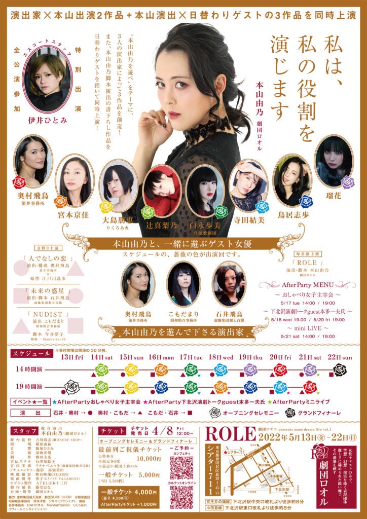 劇団ロオル(主宰:本山由乃)主催、『ROLE』が2022年5月13日 (金) ~2022年5月22日 (日)に下北沢シアター711(東京都世田谷区)にて上演されます。チケットはカンフェティ(運営:ロングランプランニング株式会社、東京都新宿区、代表取締役:榑松 大剛)にて発売中です。