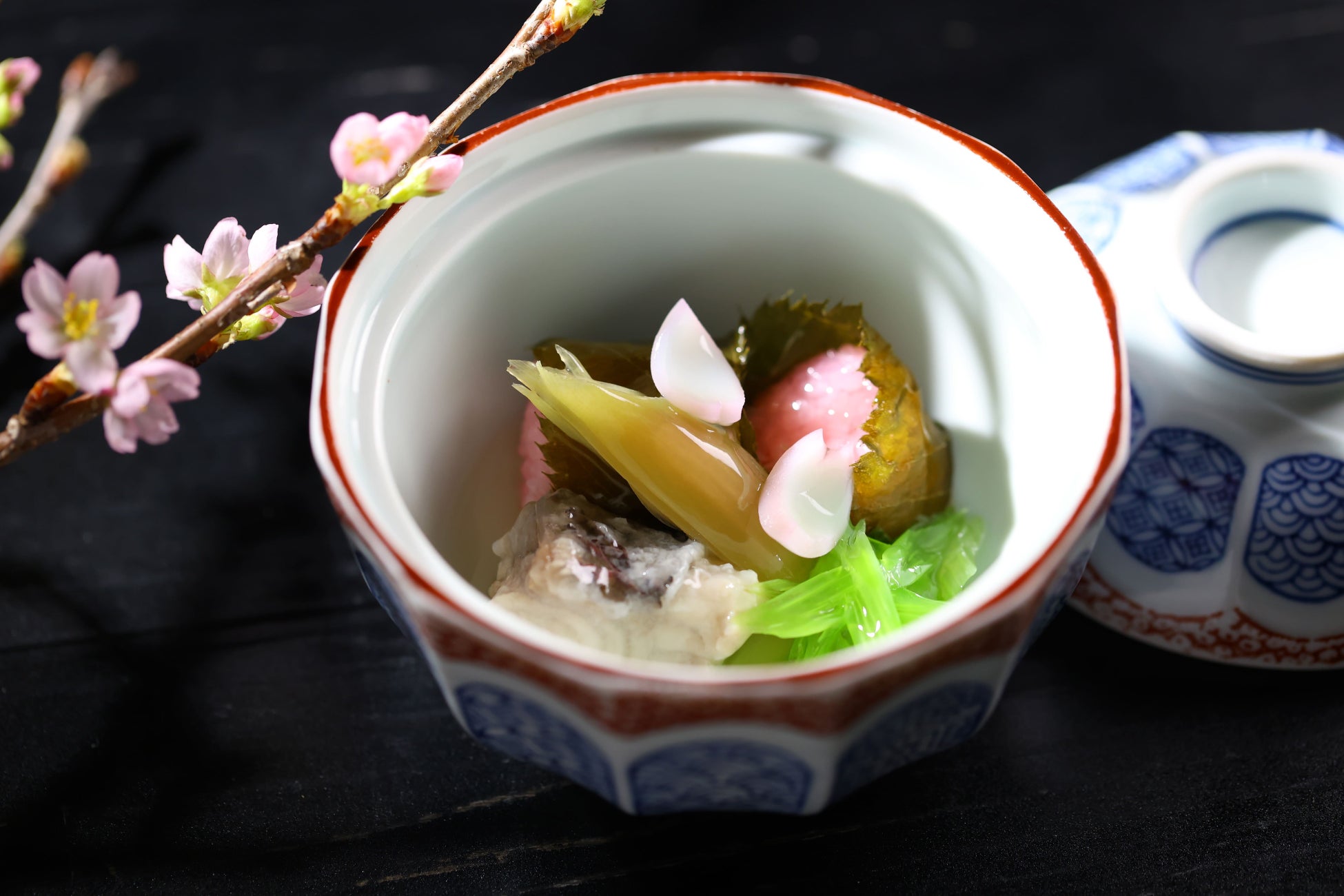 この時期に旬を迎える静岡県産の春かぶとあさりを使い、桜麩を飾ったとても春らしい一品でございます。