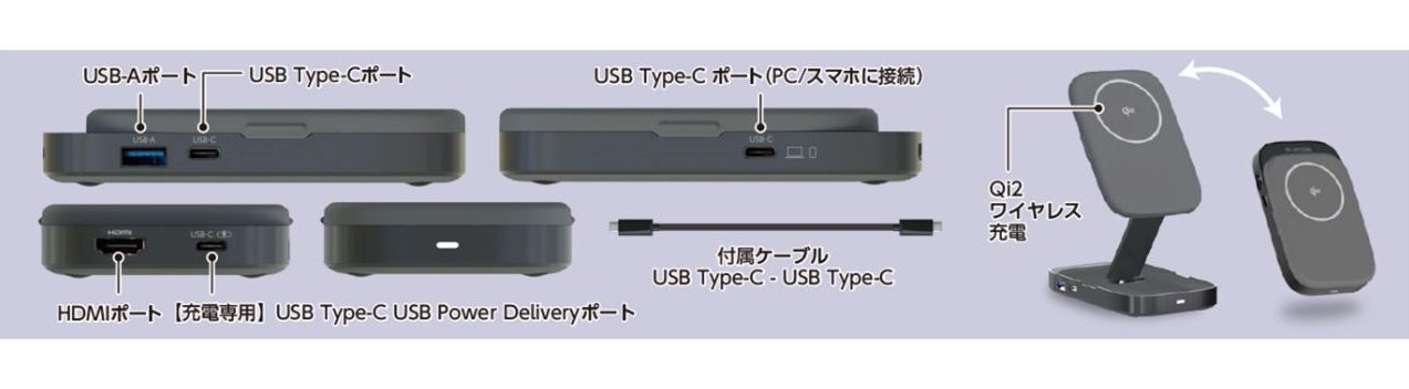 Qi2対応ワイヤレス充電スタンドを付属した、4in1ドッキングステーションです。スマートフォンのワイヤレス充電・周辺機器の接続を1台にまとめられます。