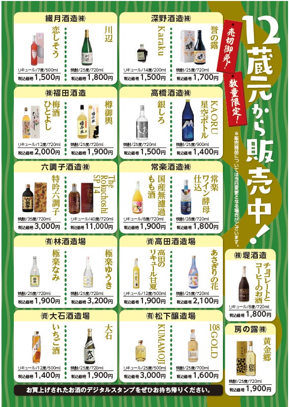 〇参加蔵元:繊月酒造株式会社、深野酒造株式会社、株式会社福田酒造、高橋酒造株式会社、六調子酒造株式会社、常楽酒造株式会社、株式会社堤酒造、房の露株式会社、合資会社高田酒造場、有限会社林酒造場、合資会社大石酒造場、有限会社松下醸造場 計12蔵元