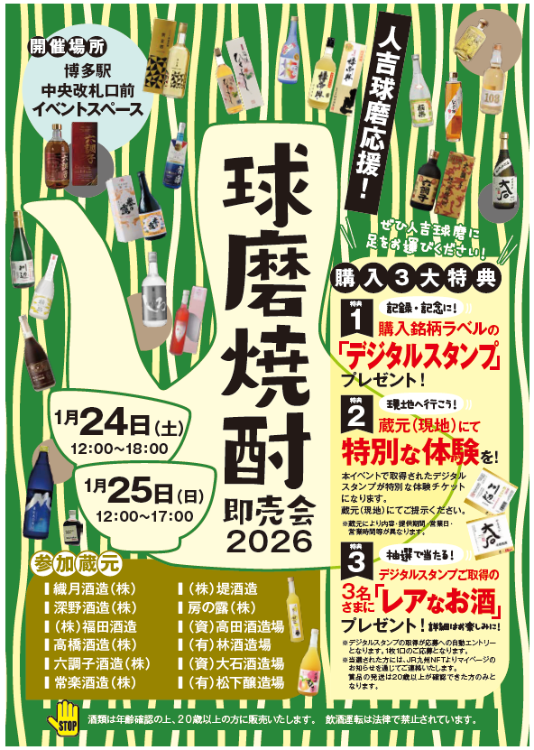九州旅客鉄道株式会社(以下「JR九州」)は、球磨焼酎酒造組合と、2026年1月24日・25日の2日間、博多駅中央改札口前イベントスペースにおいて、焼酎の即売会イベントを開催します。
