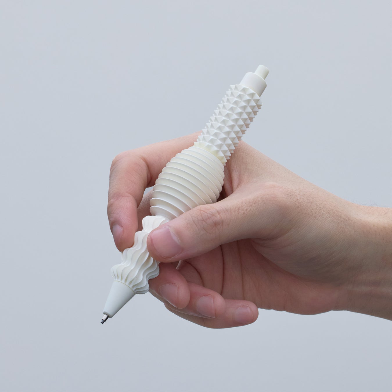 作品概要:人間の指先には多くの神経が集中しており、指先を刺激することで脳の働きは活性化されます。『NEWRON』は、グリップ部分に様々な形状の突起が施されたペンで、「かく」という作業と同時に指先から脳の働きを促し、創作活動をサポートする「アイデアを生み出すためのペン」です。