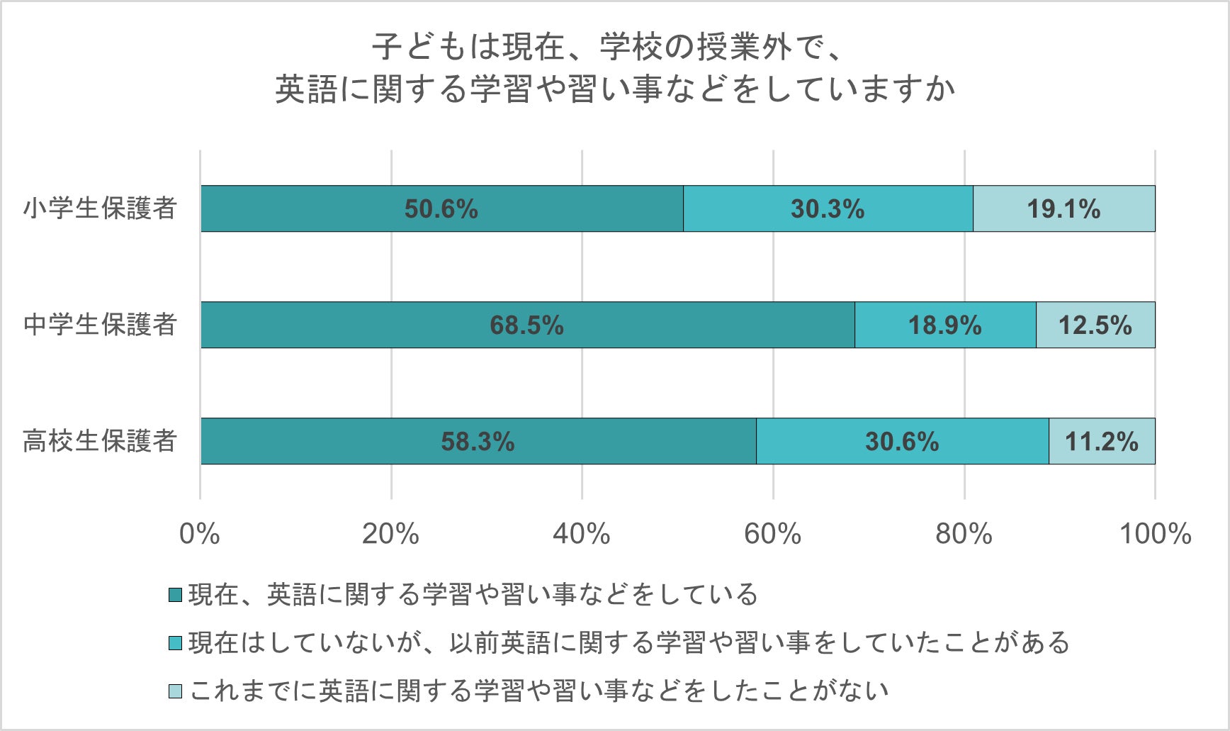 小学1年生~高校3年生の保護者に、子どもは現在、学校の授業外で、英語に関する学習や習い事をしているか、聞いたところ、小学生保護者の50.6%、中学生保護者の68.5%、高校生保護者の58.3%が「現在、英語に関する学習や習い事などをしている」と回答した。また、小学生保護者と高校生保護者の約3割が「現在はしていないが、以前英語に関する学習や習い事をしていたことがある」と回答した。
