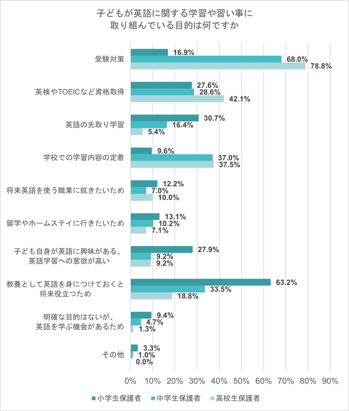 中学生保護者・高校生保護者で最も割合が高かったのは「受験対策」で、中学生保護者の68.0%、高校生保護者の78.8%にのぼった。また、「学校での学習内容の定着」と回答した保護者も中学生保護者・高校生保護者は約4割弱だった。小学生保護者では「教養として英語を身につけておくと将来役立つため」が最も多く、63.2%だった。また、「英語の先取り学習」や「子ども自身が英語に興味がある、英語学習への意欲が高い」といった回答も約3割だった。