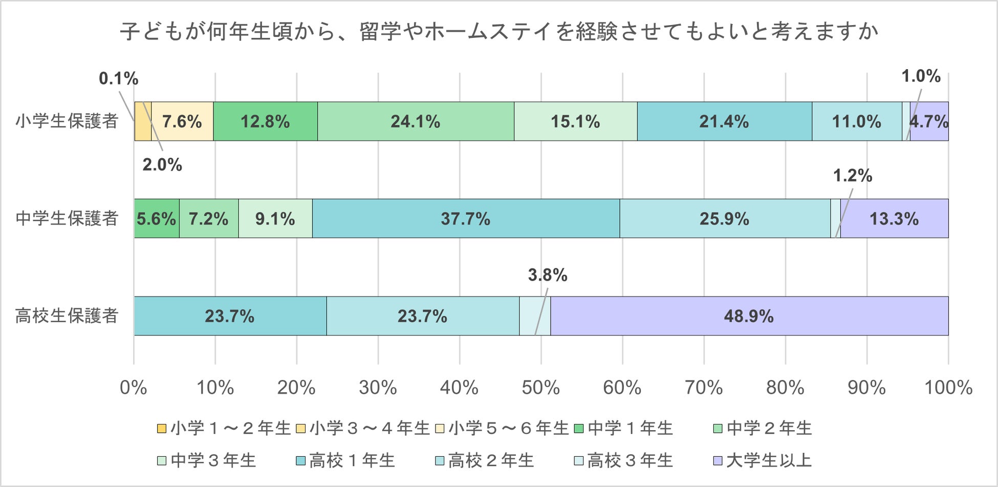 「これまでに経験はないが、今後留学やホームステイなどを経験させたい」と回答した保護者に、子どもが何年生頃から留学やホームステイを経験させてもよいかを聞いたところ、小学生保護者では「中学2年生」が24.1%、「高校1年生」が21.4%だった。中学生保護者では、「高校1年生」が37.7%、「高校2年生」が25.9%だった。高校生保護者では「大学生以上」という回答がもっとも多かった。また、小学生保護者・中学生保護者・高校生保護者とも、「高校3年生」という回答は少なかった。