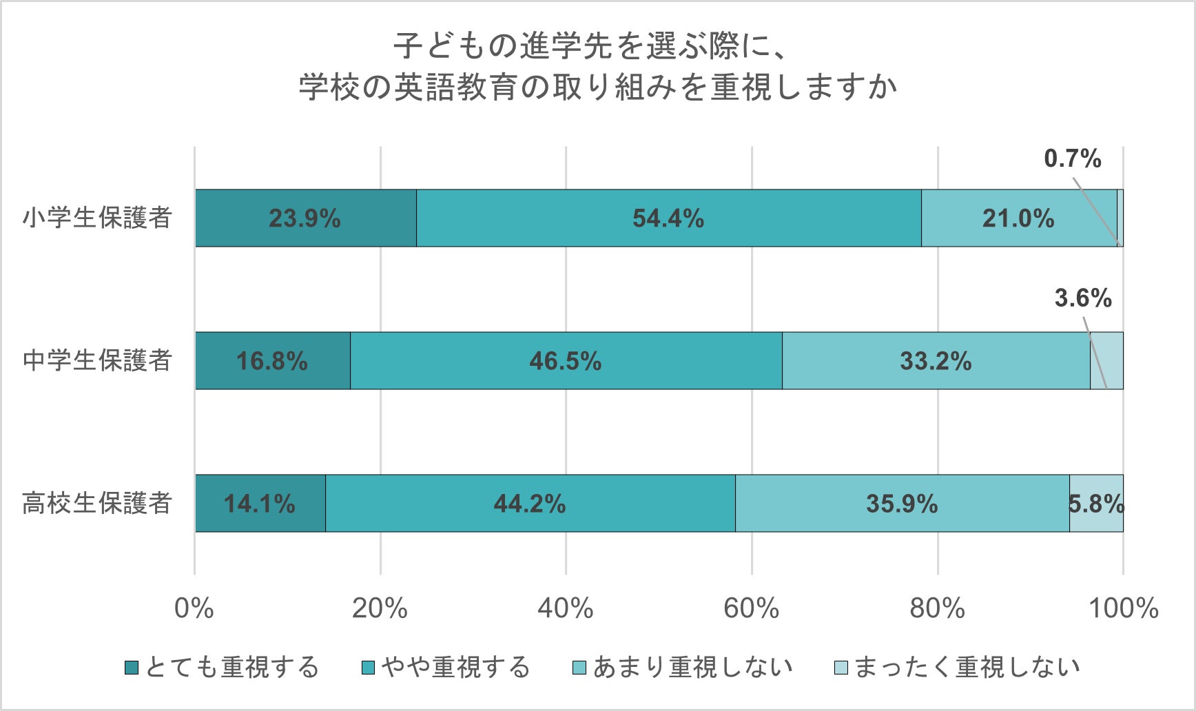 小学1年生~高校3年生の保護者に、子どもの進学先を選ぶ際に、学校の英語教育の取り組みを重視するかを聞いた。「とても重視する」「やや重視する」と回答したのは、小学生保護者の78.3%、中学生保護者の63.3%、高校生保護者の58.3%だった。子どもの年齢が低いほど、学校の英語教育の取り組みを重視する傾向が見られた。