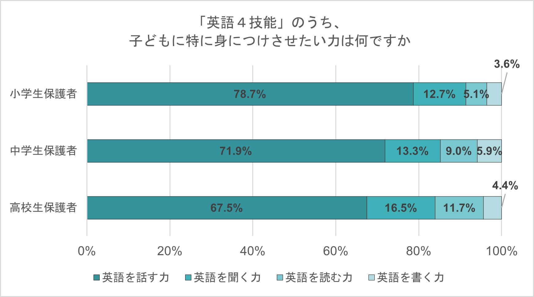 小学1年生~高校3年生の保護者に、英語4技能(話す・聞く・読む・書く)のうち、特に子どもに身につけさせたい力を聞いたところ、「英語を話す力」が最も多く、小学生保護者78.7%、中学生保護者71.9%、高校生保護者67.5%となった。
