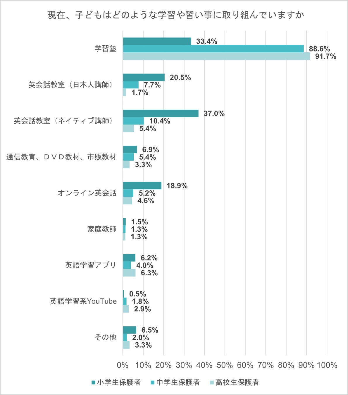 中学生保護者・高校生保護者で最も割合が高かったのは「学習塾」での英語受講で、約9割にのぼった。小学生保護者では、「英会話教室(ネイティブ講師)」が最も多く37.0%、次いで「英会話教室(日本人講師)」が20.5%だった。「オンライン英会話」に取り組んでいる小学生は2割弱だった。
